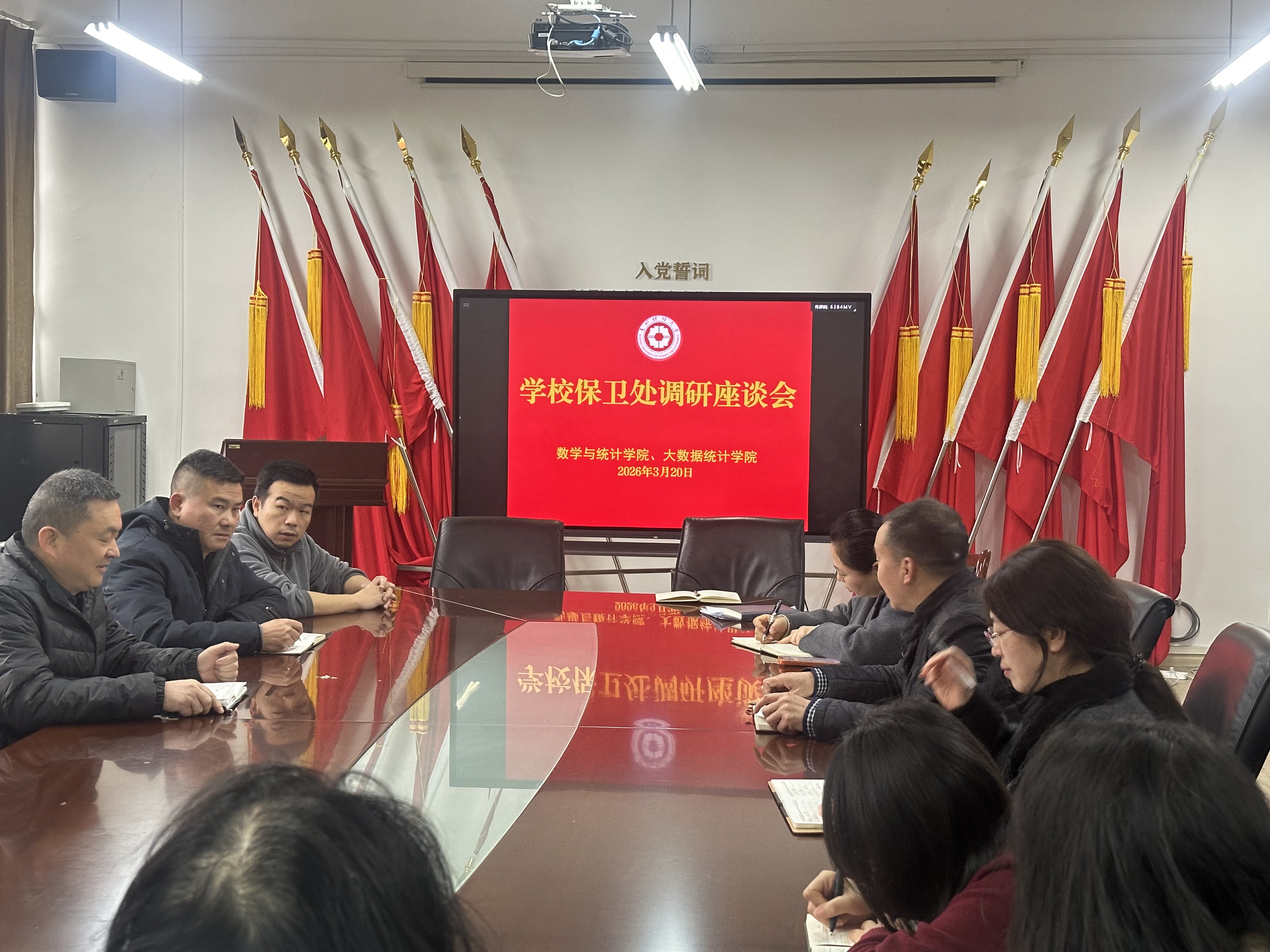 3月20日上午,学校保卫处副处长王波一行到数学与统计学院、大数据统计学院走访调研,学院党委副书记朱吉韬及全体辅导员参加座谈交流。